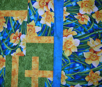 This quilt is now very large–105″ wide x 123″ long. Remember, this was a completed queen size quilt according to the pattern before I added the borders. This is such a cheerful quilt. The flowers are daffodils. April is Daffodil Month for the Canadian Cancer Society. http://www.cancer.ca/ontario.aspx?sc_lang=en Daffodil Days started back in the 1950’s. The daffodil is considered a bright, cheerful flower that creates an atmosphere that radiates hope and faith that cancer can be beaten. Just a side note, the orange fabric I chose, was from the “Quest for a Cure” fabric line. I didn’t know that detail when I was picking the fabric. It seems appropriate that a Quest for a Cure fabric would be used to compliment the daffodils in this quilt. Also, did you notice that the orange fabric was also a dot fabric–I am sure Alex Anderson would be pleased!