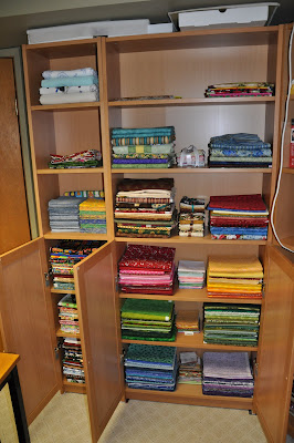 The bottom half of the shelving units houses my stash. Fabrics in my stash are organized in colour groupings. The top sections of the shelving units are open and house UFO’s and fabrics that have been committed to projects not yet started.