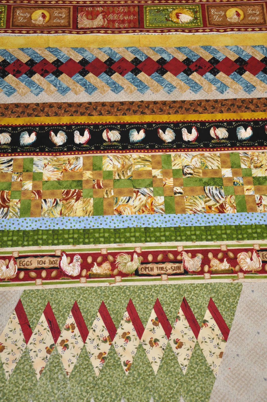 I decided to use some of my chicken fabric collection and this is what I have come up with so far. I have two complete rows of Seminole piecing and part of a third row complete. There are 5 Seminole pieced rows and several filler rows between those rows in this particular quilt pattern.
