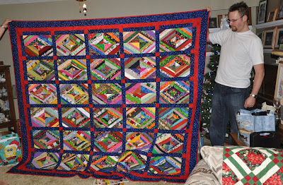 This is a picture of my husband with the fish quilt that I made him. Although this quilt was finished in time for Christmas this year, this was not a Christmas gift (not this year anyway–LOL). Several years ago, I gave my husband a completed block for this quilt as part of his Christmas present that year with a promise to finish the quilt after Christmas. I guess I should have specified which Christmas because here we are several years later and the quilt is now finished. No more cold knees for my husband, Pam !