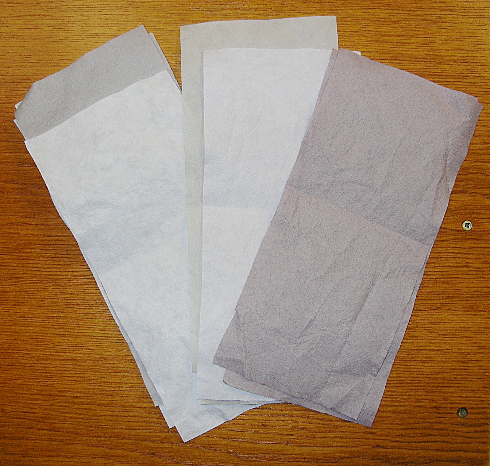 These are some of the color catchers after they have been through the wash cycle. Yes they are different colours–remember they are used and are finished their intended purpose which is trapping loose dyes in the wash cycle.