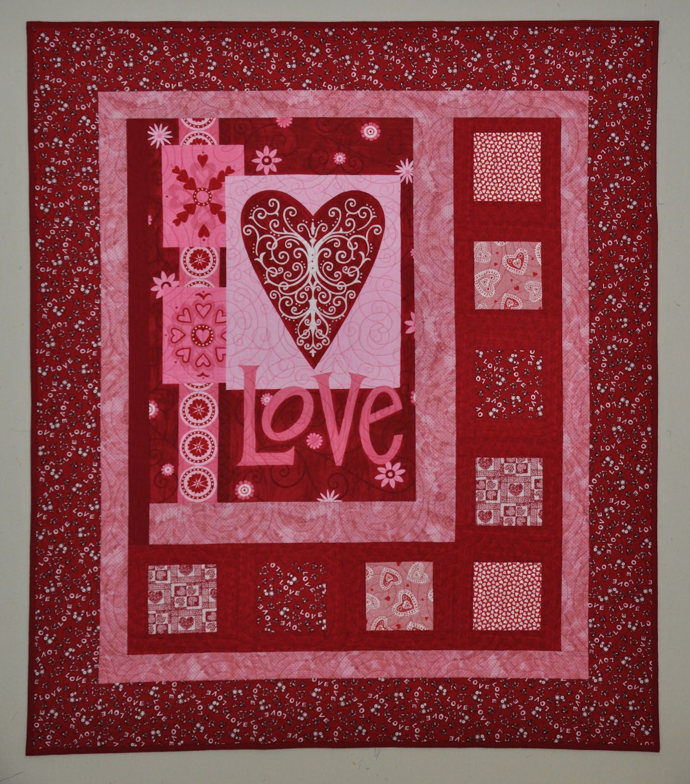 Valentine’s Day may be long past, but I only just took the last stitches on my Valentine’s Day quilt this weekend. Late for this year – early for next year!